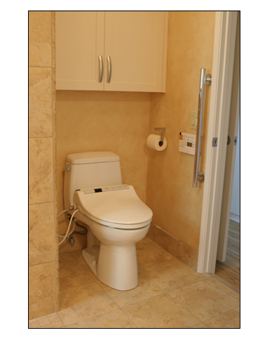 Self- closing toilet with Toto Washlet turns the toilet into a bidet without having 2 units.