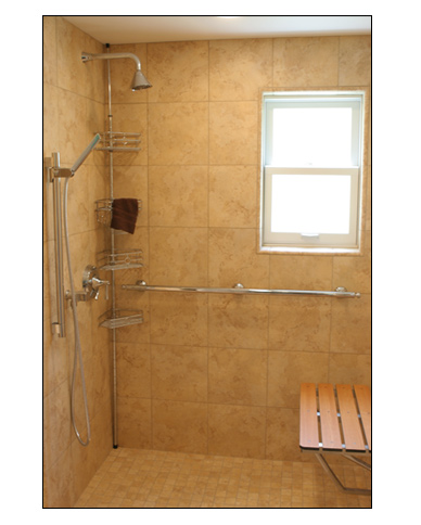 | This universal designed shower for a disabled senior has no dam allowing easy access into the shower. A drop-down seat, hand held shower head and grab bars also allow the user or caregiver to easily have a shower in comfort. A shower curtain, not shown, provides privacy. |
