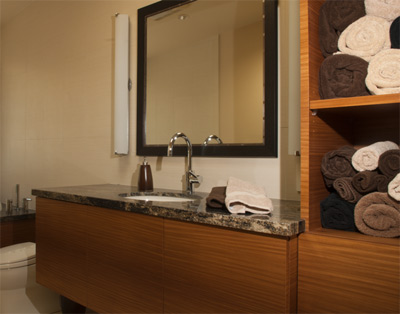 The highlight of this contemporary bathroom is the floating Afrormosia wood cabinet with a granite top and chrome sink. The cabinet is anchored on the right with storage to allow for easy access of towels. A custom mirror and vertical lighting are seen above the cabinet. |