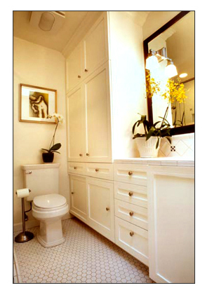 This bathroom remodel is in a 1920s beach bungalow. In order to create more storage and a larger shower, we incorporated part of a hallway/laundry room and reconfigured the Master Bedroom closet. We gained space in the closet by using a closet company to double the existing space. In keeping with the feeling of the house, we used white and black tiles with a design reminiscent of the 20s. A large mirror and a frameless shower door enlarge the space and a tall cabinet next to the toilet provides storage. |