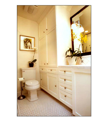 This bathroom remodel is in a 1920s beach bungalow. In order to create more storage and a larger shower, we incorporated part of a hallway/laundry room and reconfigured the Master Bedroom Closet. We gained space in the closet by using a closet company to double the existing space. In keeping with the feeling of the house, we used white and black tiles with a design reminiscent of the 20s. A large mirror and a frameless shower door enlarge the space and a tall cabinet next to the toilet provides storage.