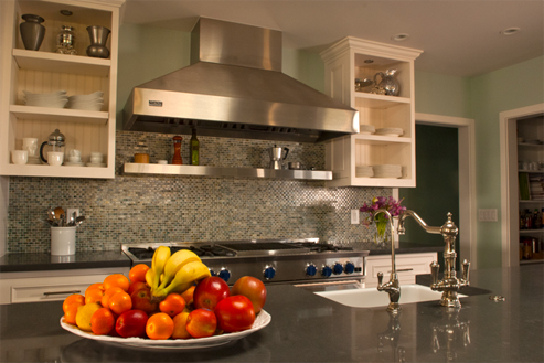 The commercial grade range is highlighted with a backsplash of mini glass mosaics in the colors of the ocean. The stainless shelf and open cabinets make it easy to access everyday items. An extra sink allows a second clean-up station. The counter is Ceasarstone Raven. To the right is a walk-in pantry and a built in banquette and table for the family of five.