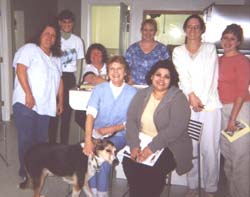 Hollywood, our favorite Australian Kelpie/Border Collie mix, owns our head technician, Ronnie; Cheryl, technician assistant, holding Hollywood; Cathy and Leslie, groomers extraordinaire; Bonny, receptionist; Tina, receptionist and technician assistant; Dr. Jones; Stephanie, receptionist; Ronnie, Registered Veterinary Technician and Hollywood's person. Not pictured, Lois Hild, DVM, Staff Veterinarian, and Sue, Practice Manager, the photographer
